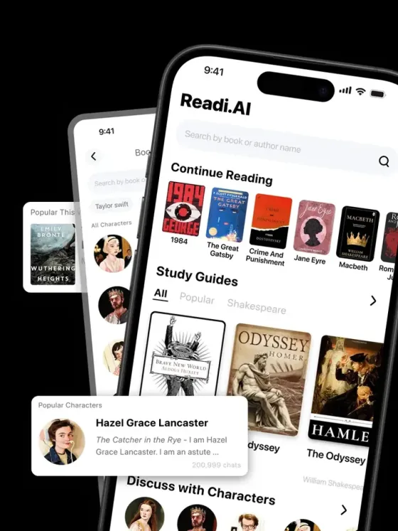 Readi.AI is an iOS app that gives high school and college students chapter-by-chapter summaries, character analysis, themes, and interactive character chat. Use it for class prep, essay planning, and exam review — on your phone, between classes.